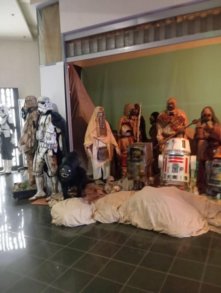 Balra egy kisebb Millenium Falcon belsőt ábrázoló nagy installáció és rajta a fiatal Solo kapitány szerepel.