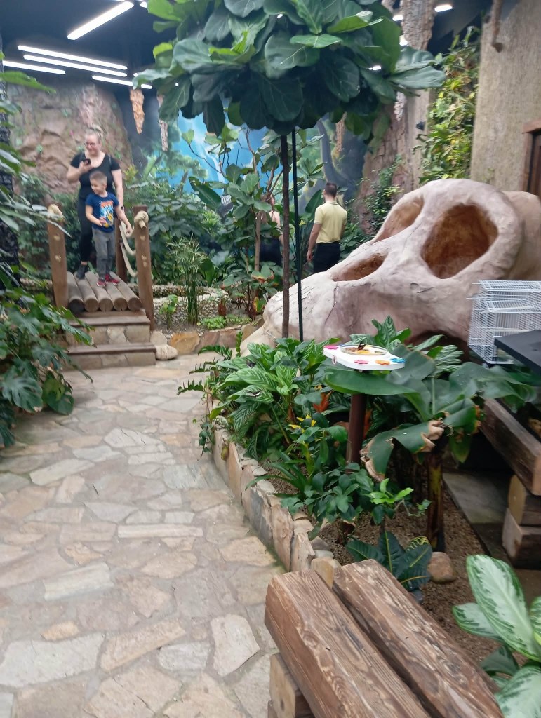 Az egyik kedvencem a kék lepke, külső része barna szemet mutat, mint egy rejtőzködő bagolyé, vagy madáré, de lehet egy fában kirajzolódó szem minta is. Belső felén azonban csodás kék színe van. A világ több tájegységéből érkeznek bábok és kis tojások, melyek itt kelnek ki: Indiából, Afrikából, Ausztráliából, és még sok helyről. A lepkék mellett kismadarak is repkednek, és fürjecskék is szaladgálnak.Az egésznek olyan kialakítása van mint egy trópusi esőerdőnek.